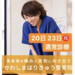 いつもかわしまはりきゅう整骨院をご愛顧いただきありがとうございます。 不安定な天候が続いていますが、皆さま体調はいかがでしょうか? 20日(月・敬老の日)23日(木・秋分の日)は祝日ですが 通常の時間で診療いたします。 9:00~12:00 15:00~20:30 ご予約・お問い合わせは ...