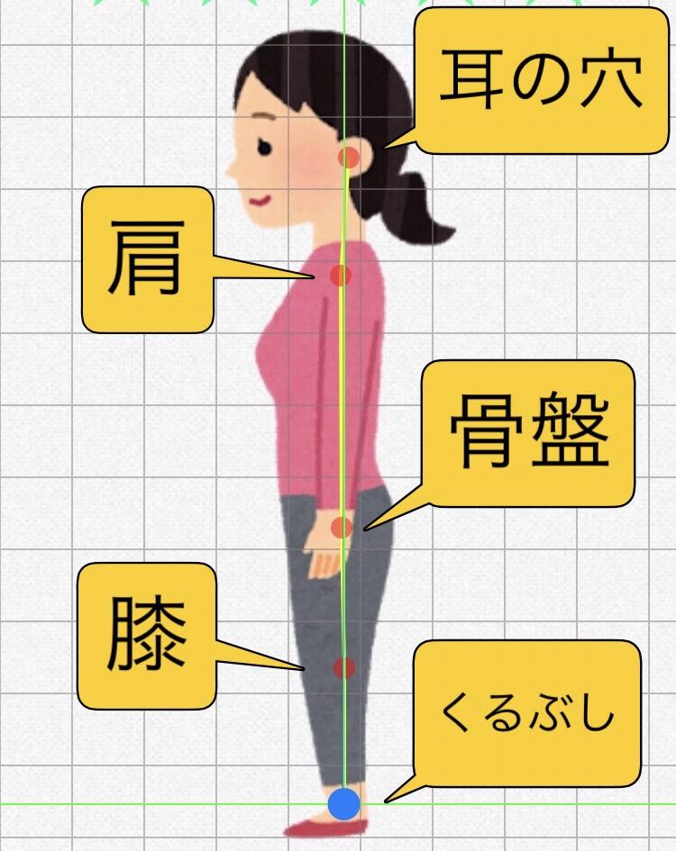 ゴールデンライン・・・耳・肩・骨盤・足首が一直線になっているのが正しく美しい姿勢なのです。