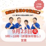 こんにちは かわしまはりきゅう整骨院野間院です。 気圧の変化など不安定な天候が続いていますが、皆さん体調は いかがでしょうか? 9月23日(火)は秋分の日で祝日ですが 当院は9時~18時(お昼休みなし)でご予約を受付しております。 少しでもお身体に違和感や不調を感じられたら当...