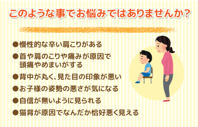 当院の「猫背矯正」は小学生のお子さまからシニアの方まで安心して受けられます。